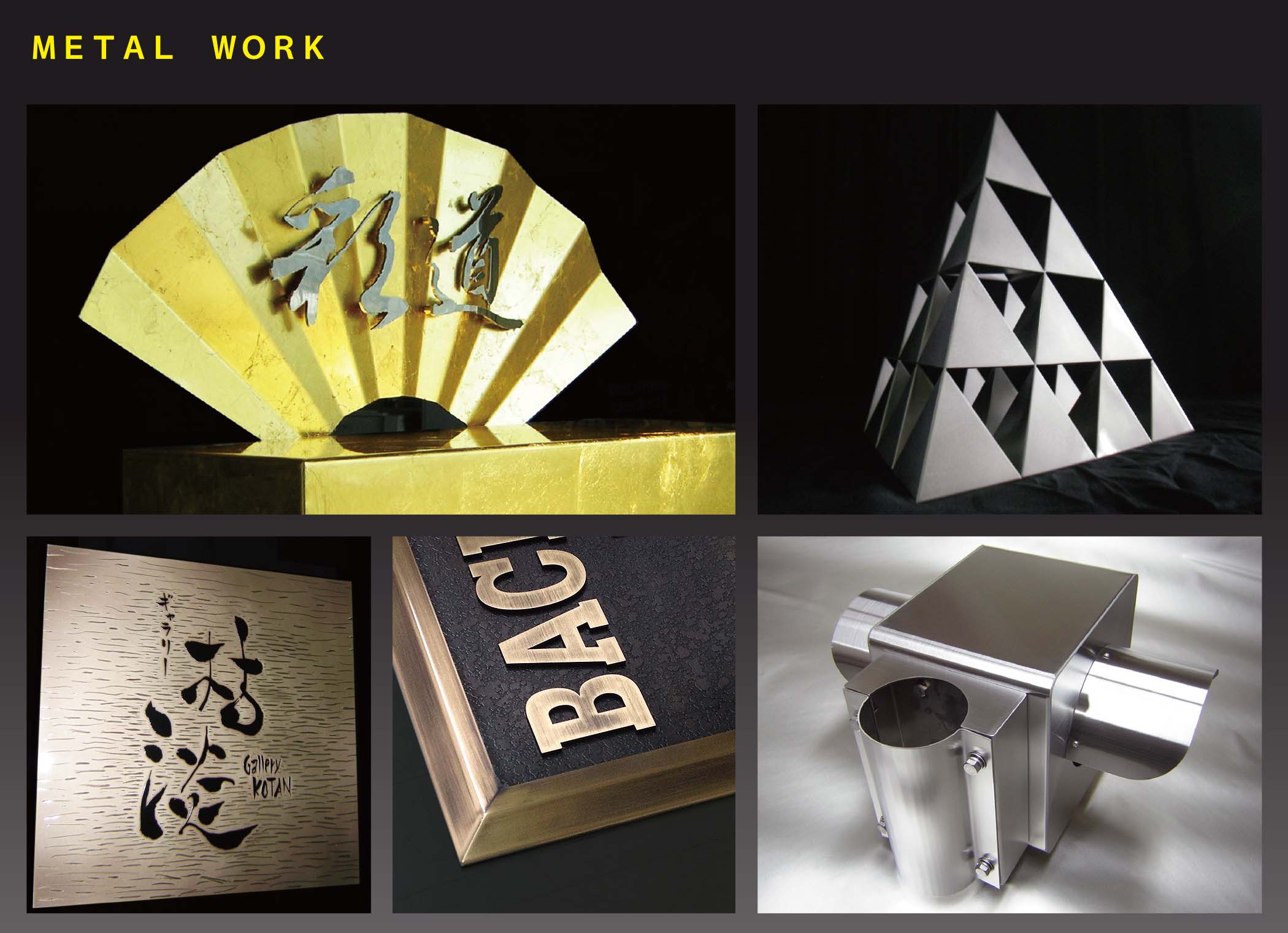| 事業内容 | 看板の企画・設計〜製造〜施工 CO2レーザー加工、ステンレス板金加工、ルーター加工 表札・装飾品、金属看板、金属銘板、アクリル加工 切文字、箱文字、LED・電照看板、ステンシルプレート 木製看板、レーザー・ルーター・サンドブラスト彫刻 インクジェットプリント、カッティングシート仕上げ 模型製作、各種名札 他 |