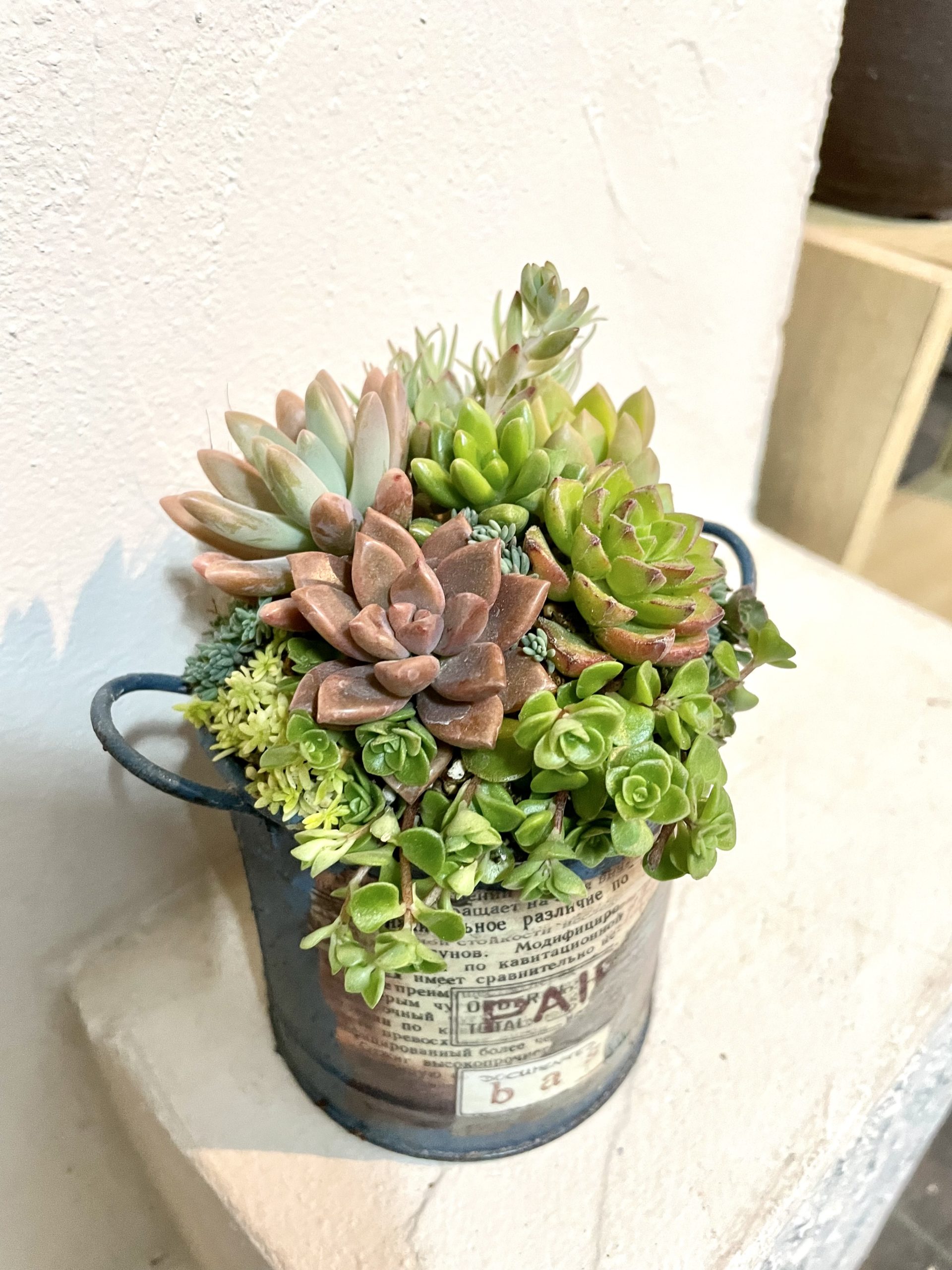 木材や缶詰など多様な材料を使ったリメイク鉢の制作